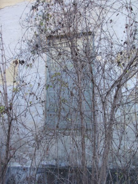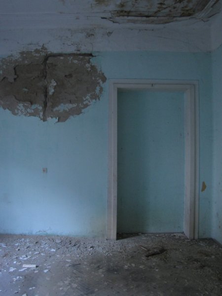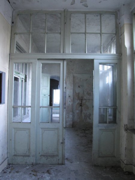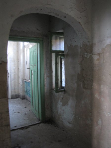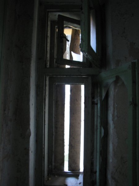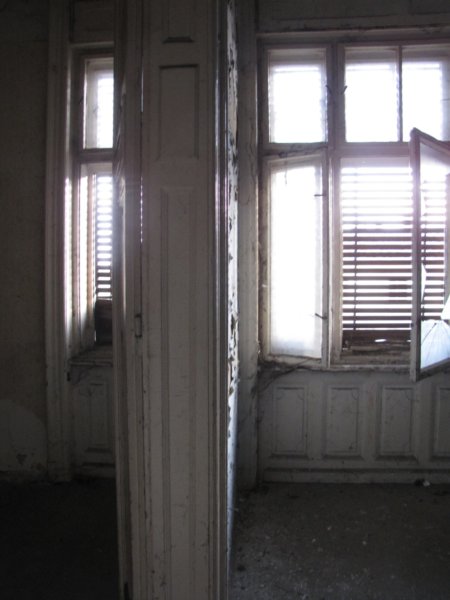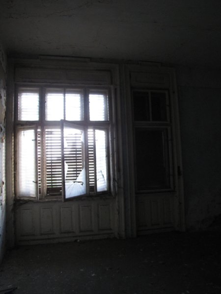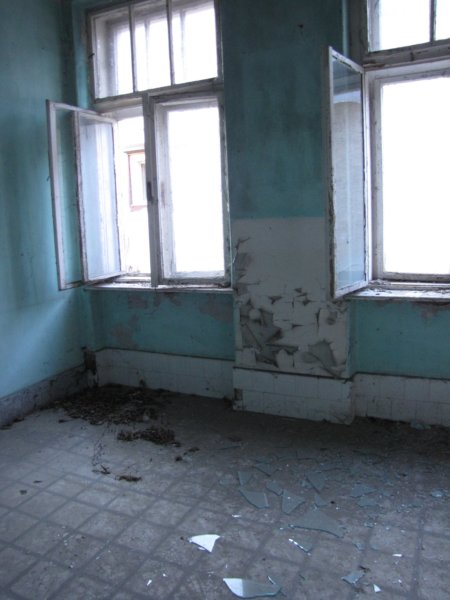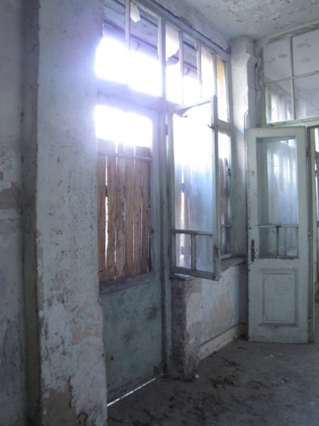 Mindenhol üvegcserepek a betört ablakokból… ezek az ablakok oldalra néznek. Valaha itt lehetett a konyha.