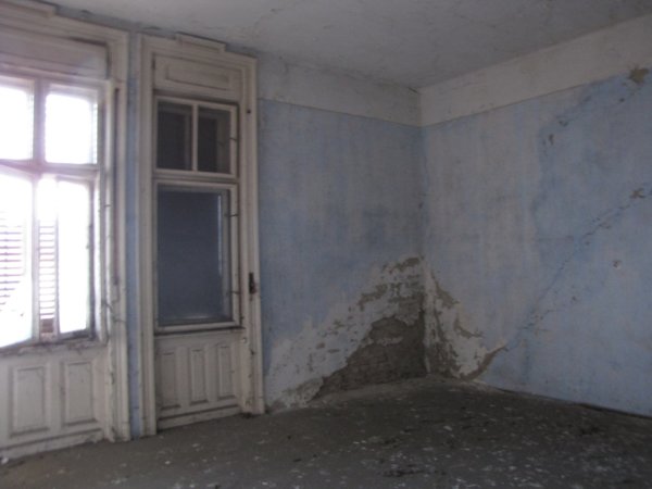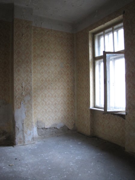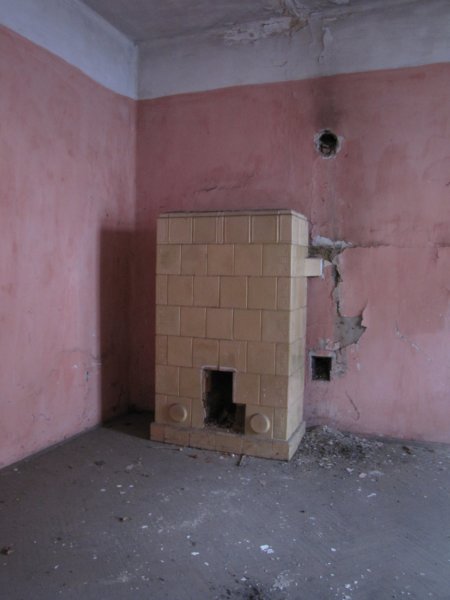 Szoba egy majdnem ép cserépkályhával… persze a fém ajtókat kiszedték belőle 🙁