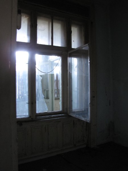 Az előtérre néző ablak. A felosztás után az előző szobához tartozó konyha lehetett. Mellette volt egy picike fürdőszoba.