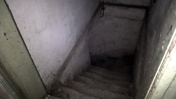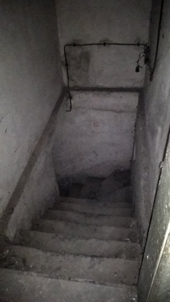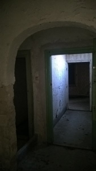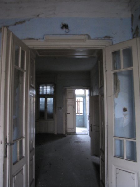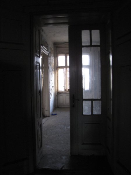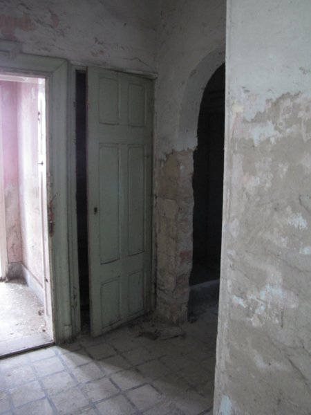 A bejárat felé visszafordulva. Sajnos ez a fotóm elég homályos lett, de látszik, hogy az eredeti hall/étkező (?) is ehhez a lakáshoz tartozott a feldarabolás után.